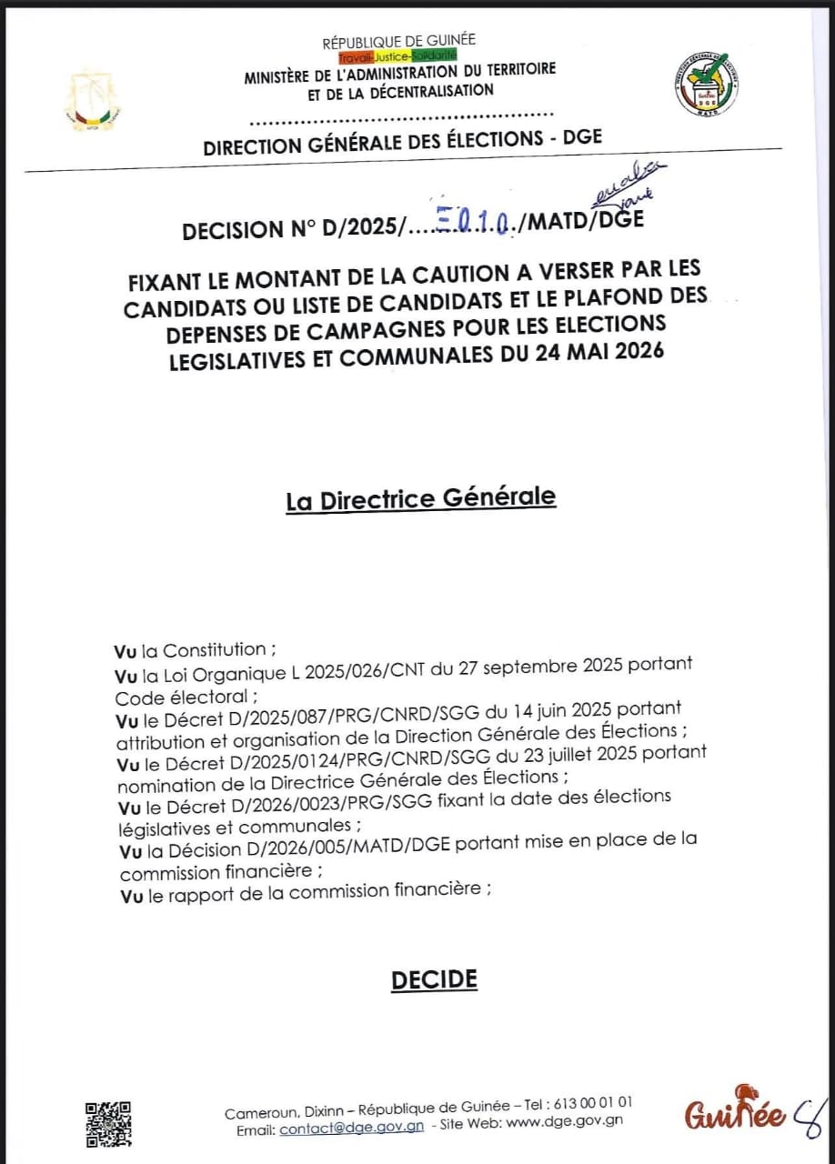 Les candidats aux listes nationales législatives devront verser 300 millions GNF, ceux aux élections uni-plurinominales 100 millions GNF, et les listes communales 35 millions GNF.