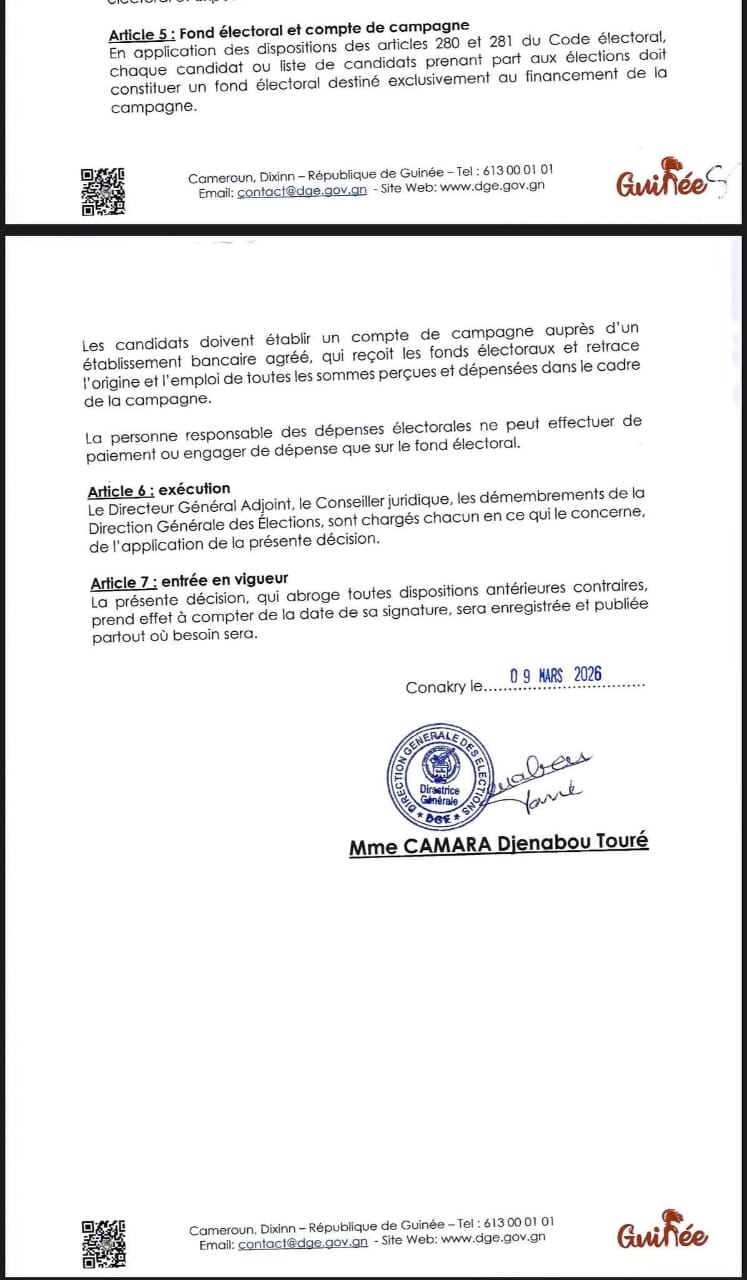 La DGE rappelle que toute dépense excédant ces montants constitue une violation du Code électoral et exige que chaque candidat ouvre un compte de campagne retraçant l’origine et l’usage des fonds électoraux.