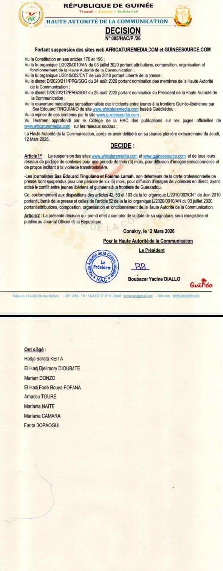 La Haute Autorité de la Communication (HAC) a annoncé, ce jeudi 12 mars 2026, la suspension de deux sites d’information en ligne, Africature Media et Guinee Source, ainsi que de deux journalistes, pour une durée de trois mois.