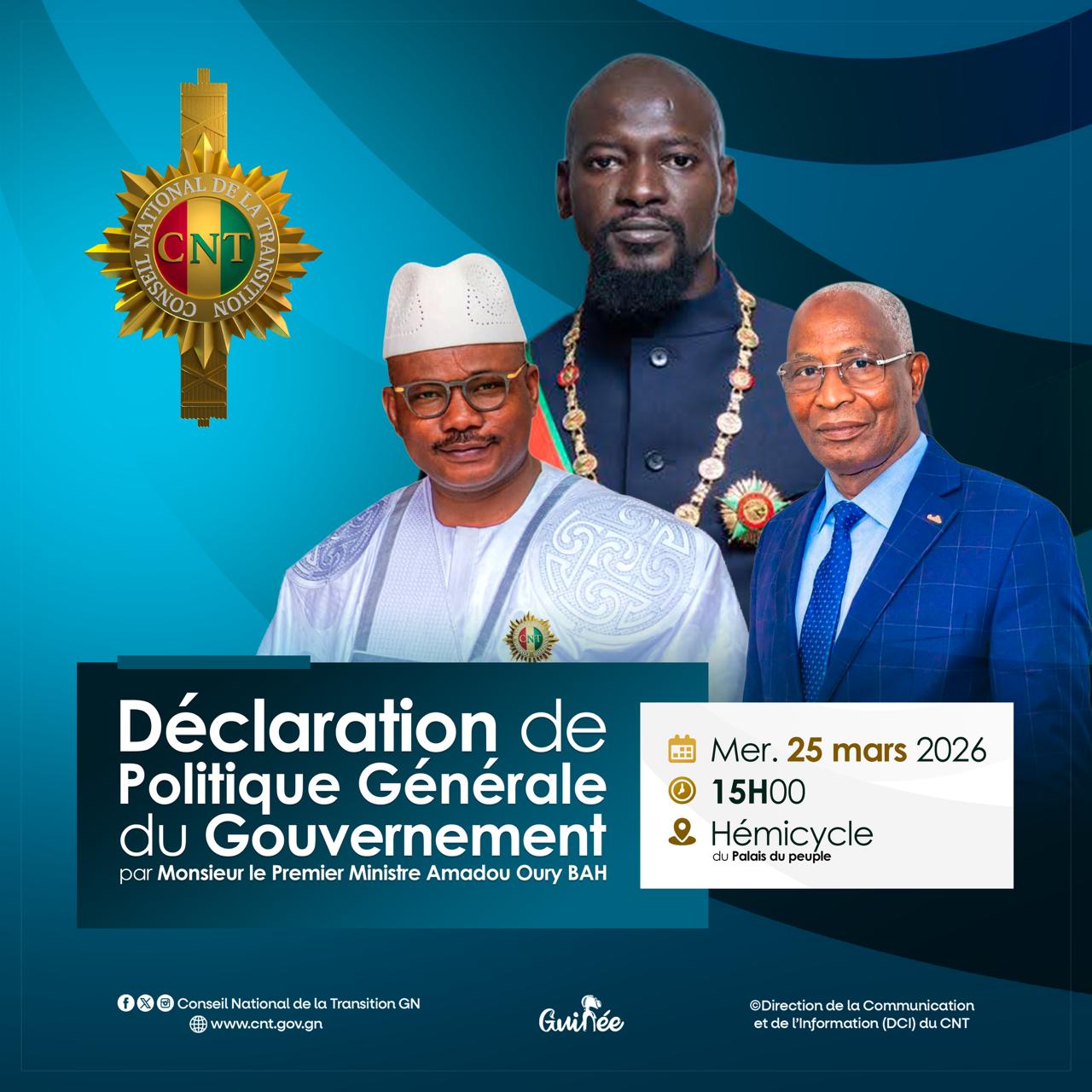 Le Premier ministre de la République de Guinée, Bah Oury, s’exprimera ce mercredi 25 mars 2026 devant les conseillers nationaux du Conseil national de la transition (CNT), à partir de 15 heures, pour présenter les grandes orientations de la politique générale de son gouvernement.