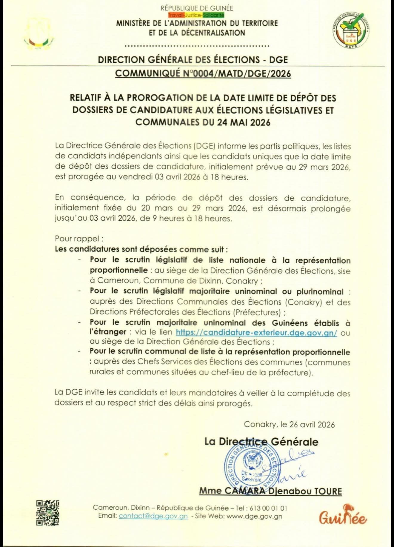 Cette prorogation vise à permettre aux partis, indépendants et candidats de finaliser leurs dossiers dans les délais, tout en respectant les procédures établies par l’administration électorale, selon le communiqué officiel publié à Conakry.