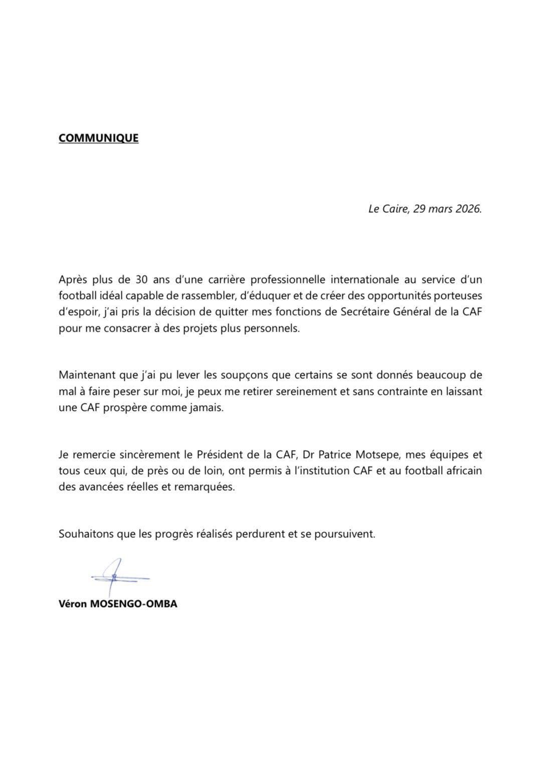 Après cinq années passées à la tête de l’administration du football africain, Véron Mosengo-Omba a officialisé sa démission du poste de Secrétaire Général de la CAF ce dimanche 29 mars 2026. Le dirigeant helvético-congolais, figure centrale de l’organisation de la CAN 2025 au Maroc, a justifié son départ par la volonté de se consacrer à des projets personnels après plus de trois décennies de carrière internationale.