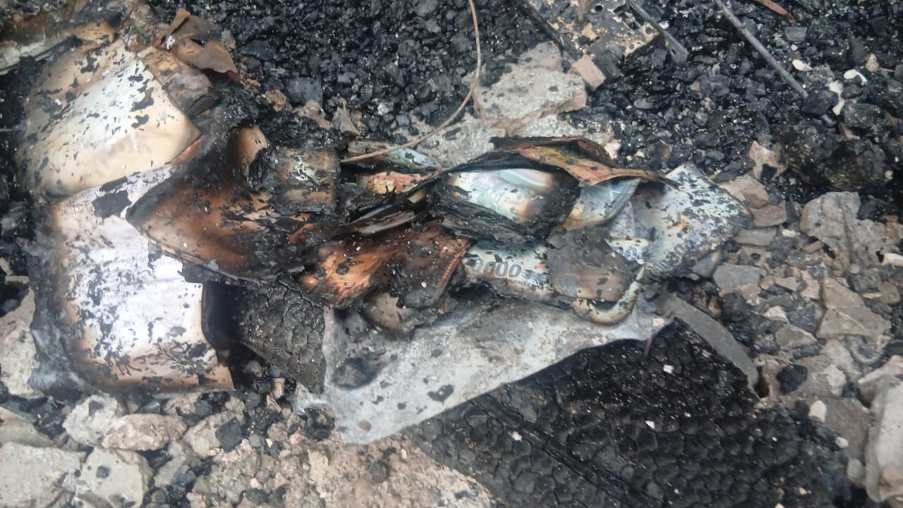 Malheureusement, une grande partie de cet argent a été détruite dans l’incendie. Sur les lieux, seuls quelques restes de billets calcinés ont pu être observés, éparpillés parmi les décombres, ressemblant à des feuilles brûlées.