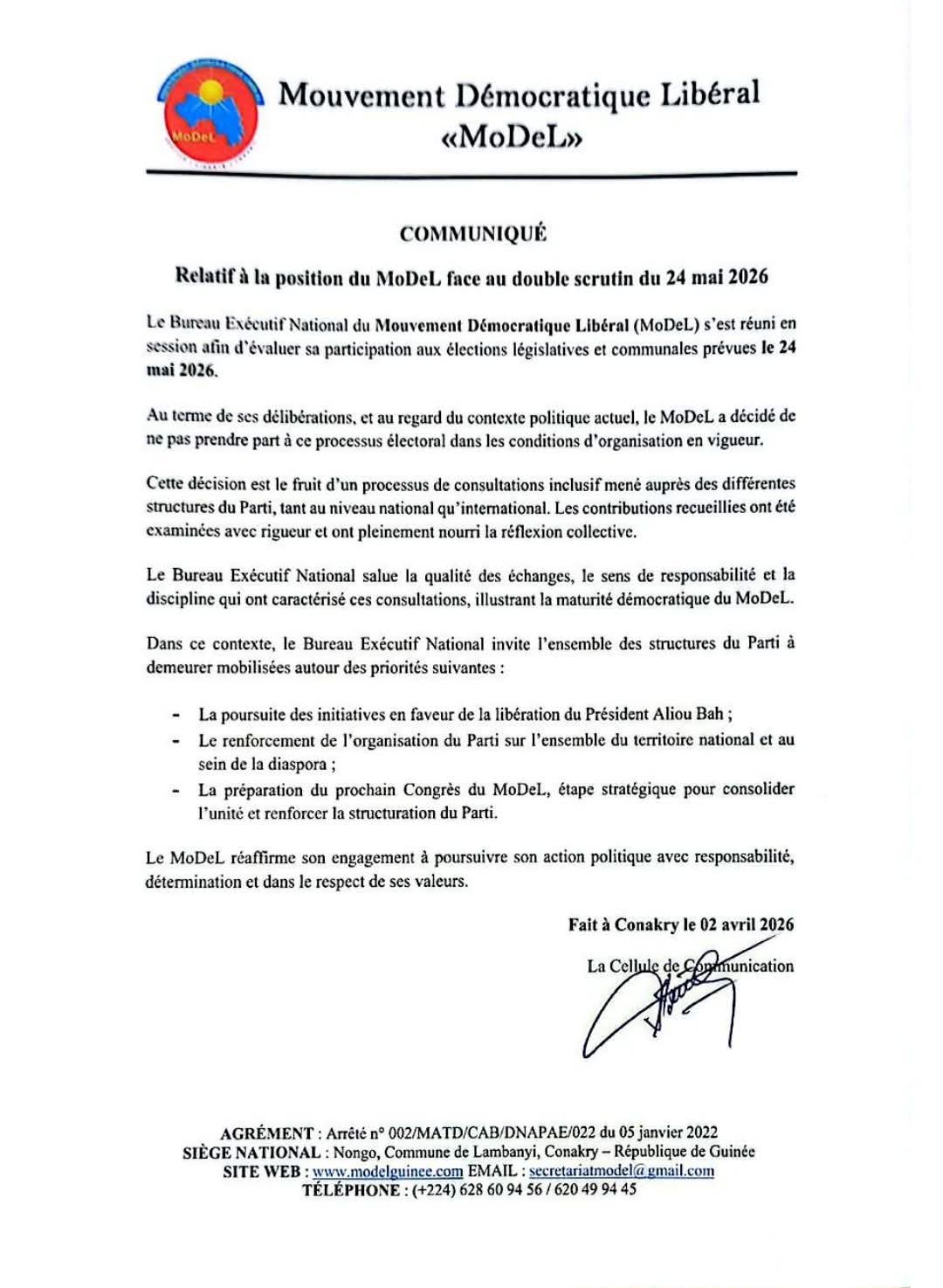 Le (MoDeL) a annoncé, mardi 2 avril 2026 à Conakry, sa décision de ne pas participer au double scrutin législatif et communal prévu le 24 mai, invoquant un contexte politique jugé non propice et des conditions d’organisation contestées.