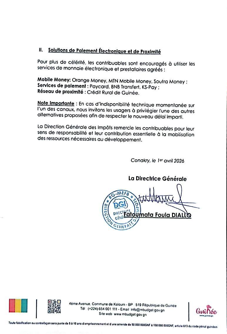 Pour faciliter le paiement dans ce court délai, la Directrice Générale de la DGI, Fatoumata Foula Diallo, rappelle que plusieurs canaux sécurisés restent à la disposition des usagers. Outre le réseau bancaire classique (BCI, Diama Bank, Orabank, Vista Bank), les contribuables sont vivement encouragés à utiliser les solutions de paiement électronique pour plus de célérité.