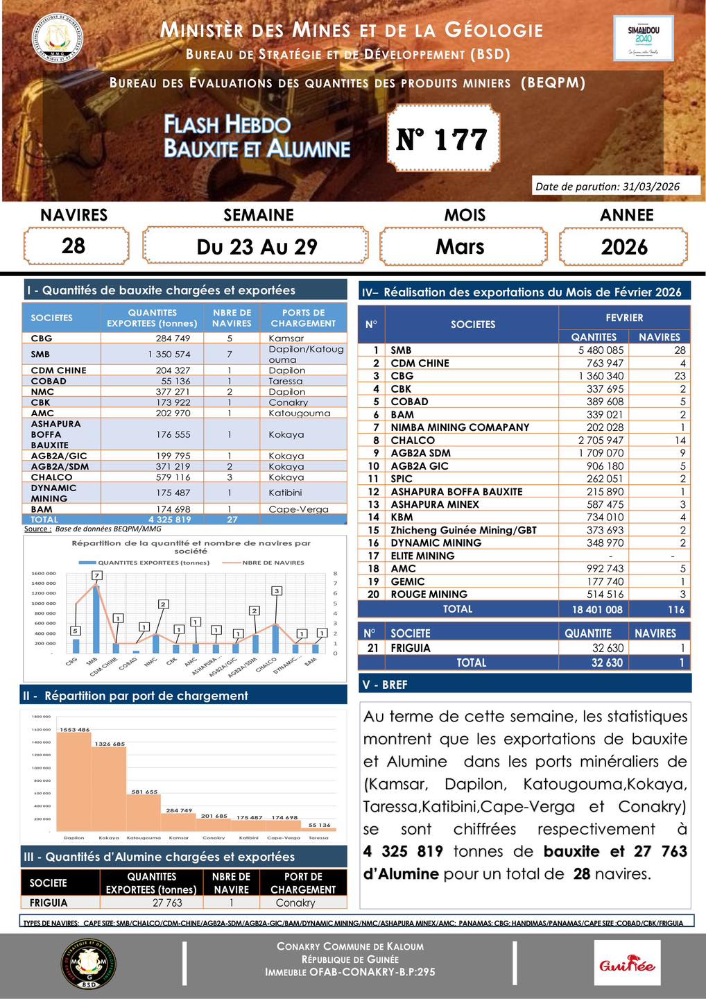 Selon le dernier bulletin « Flash Hebdo » (n°177) publié par le Ministère des Mines et de la Géologie, les exportations minières guinéennes ont maintenu une dynamique soutenue durant la semaine du 23 au 29 mars 2026. Au total, 4 325 819 tonnes de bauxite et 27 763 tonnes d’alumine ont été chargées à bord de 28 navires à travers les principaux ports minéraliers du pays.