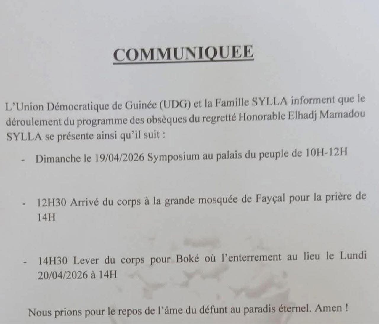 Le lundi 20 avril, l’inhumation aura lieu à 14h à Boké, sa ville natale, en présence de proches, de la famille Sylla et de nombreux acteurs politiques et économiques.