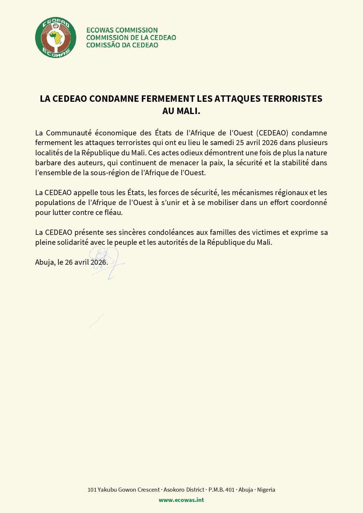 La Communauté économique des États de l’Afrique de l’Ouest (CEDEAO) a exprimé une vive condamnation à la suite des attaques terroristes survenues le 25 avril 2026 dans plusieurs localités du Mali.