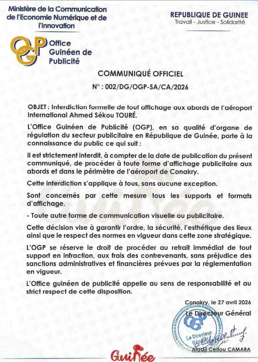 Dans un communiqué publié le 27 avril 2026, l’Office guinéen de publicité (OGP) annonce l’interdiction immédiate de tout affichage publicitaire aux abords de l’aéroport international Ahmed Sékou Touré.